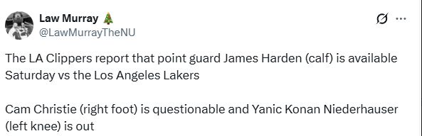 北京时间12月20日,湖人和快船更新了明日洛城德比的伤病报告,此前因小腿伤病休战一场的哈登,确定可以出战本场比赛。具体伤病名单如下——