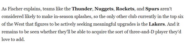 北京时间12月24日,据名记Fischer报道,雷霆、掘金、火箭、马刺、森林狼本赛季大概率不会有重磅交易动作,目前西部前六名球队中,唯一有意积极寻求实质性补强的就只剩湖人,而他们能否签下心仪的“3D球员”,仍有待观察。